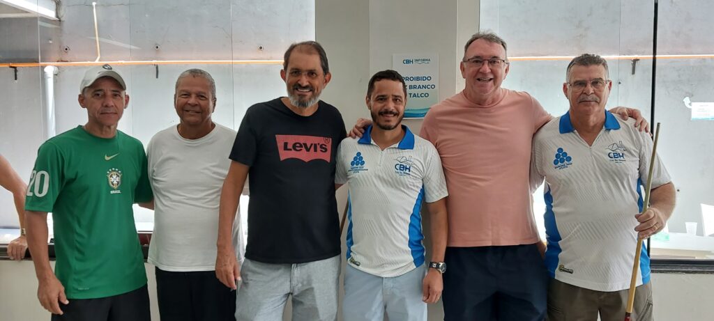 Geraldo Gonzaga, diretor de Esportes do CBH; Natanael Ribeiro, jogador da série prata; Almir Caixeta, presidente do CBH; Leonardo Viana, coordenador da Sinuca CBH; Carlão, diretor de Sede CBH; José Oliveira, jogador da série prata.