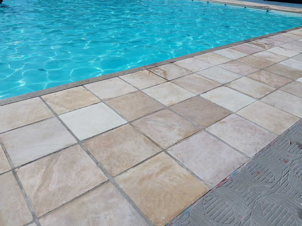 O piso em todo o entorno das piscinas foi revitalizado, passando por um processo de restauração da aderência com a remoção da aspereza e das crostas de calcário das pedras São Tomé. A aderência é importante para evitar acidentes e, com a limpeza, o aspecto ficou muito mais agradável.