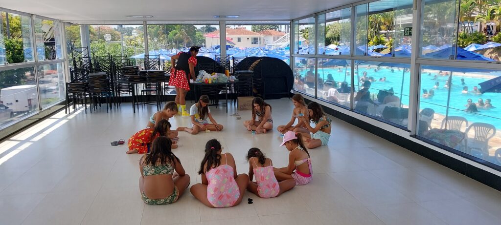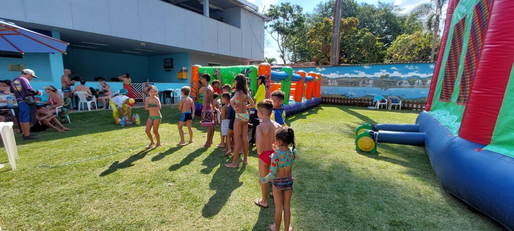 Na parte da tarde, várias atividades recreativas foram realizadas tanto no gramado quanto ao redor da piscina com o Palhaço Bisnaguinha. Tiveram jogos de perguntas, boliche, brincadeiras que estimulam a imaginação e distribuição de brindes!