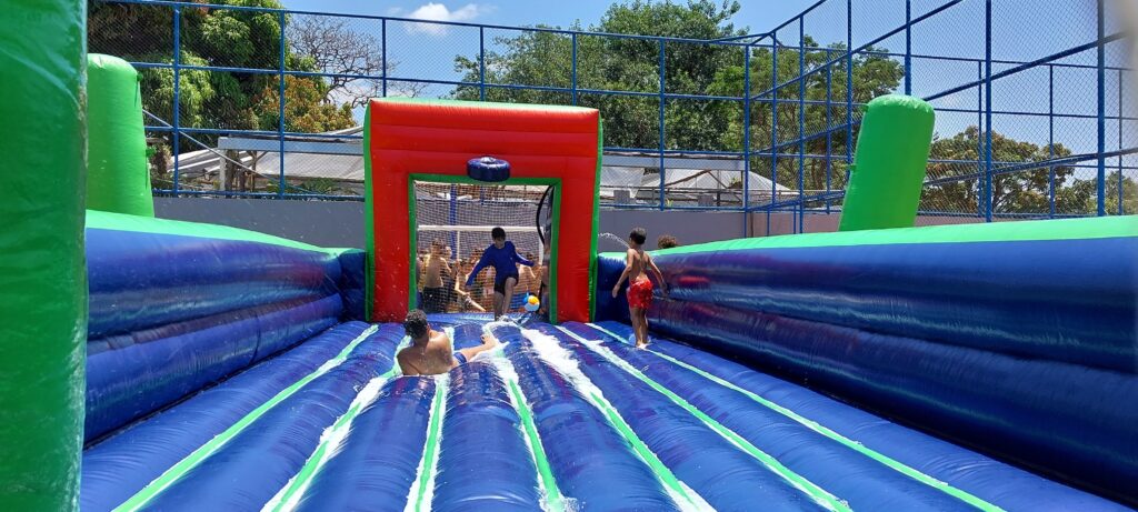 Os brinquedos infláveis foram montados no gramado ao lado do Espaço Criança e o futebol de sabão na quadra poliesportiva. Diversão garantida, com muito pula-pula da criançada, escorregadas, risadas e vários gols marcados!