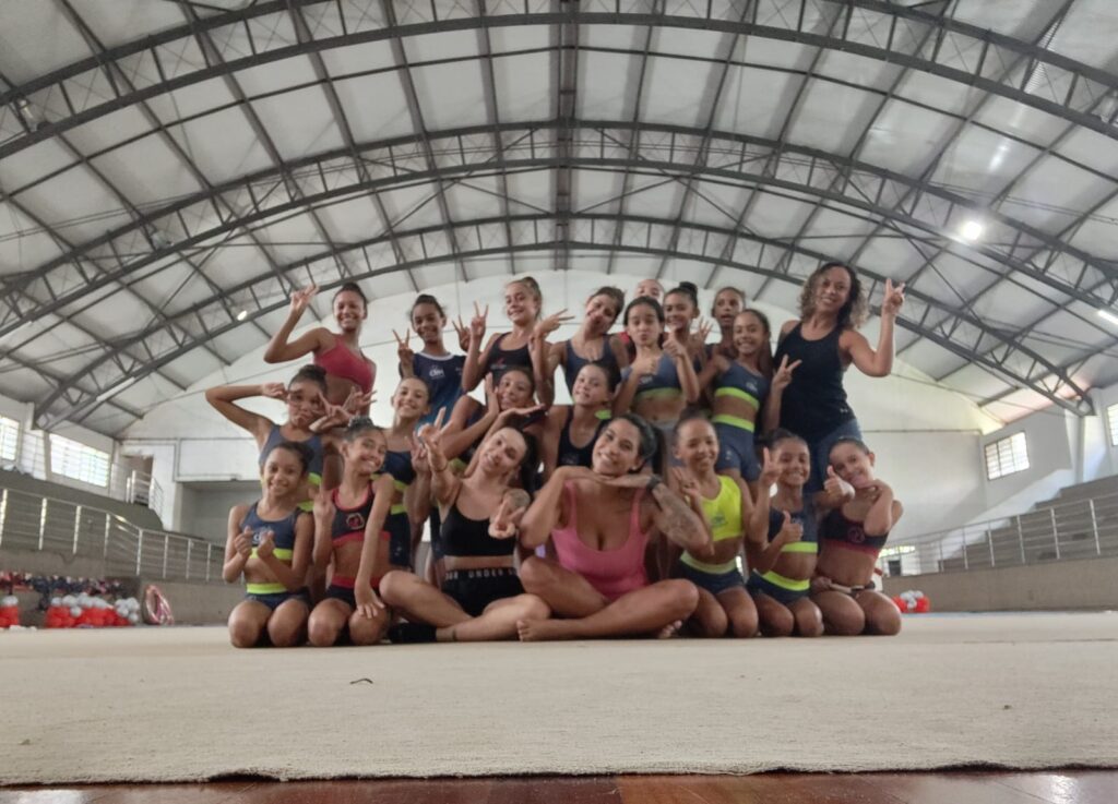 Equipe de Ginástica Rítmica do CBH e sua treinadora Daniela Oliveira ao lado de Camila Ferezin